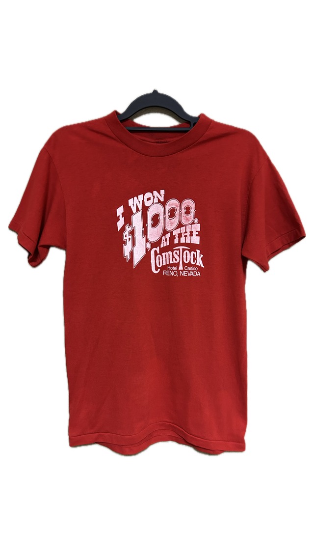 【商品について】 50%コットン50%ポリエステル L ホテル | アメリカ合衆国 ネバダ州 リノと書いてある 80sカジノTシャツです!✨ プリントの剥げ具合も丁度カッコいい感じです!! 首元のヨレ感もあまり感じないので服自体の状態はかなりいい感じです!! 【サイズ】 肩幅46 身幅45 着丈64 袖丈17 平置き実寸 【カラー】 赤 【状態】 プリントが剥げている 前面後面に重度のシミ 使用感あり 簡易包装にて1〜3日程度で発送いたします!! 古着という事なので返品対応出来かねます。 ご理解いただけますようお願い致します!